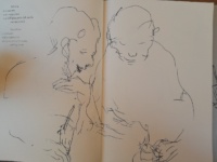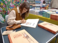 Und ein Buch aus Belarus, das wir leider nicht lesen können: drei Gedichte von ihr sind darin, eines gleich am Anfang. Und am Mittwoch fuhr uns Gareth auf die Messe, wo Zaro auch den Cambridge Stand besuchte, wo sie damals ihre Illustratorin Junli Song entdeckte. Und sich dann mit uns und unserer Freundin Chiara Foddis traf und mit ihr über ihre Illustrationen redete und mit ihrem genauen Blick und ihrem großen Herz wundervolle, präzise Kommentare gab und Chiara ermutigte. In bocca al lupo, Chiara! Und: Next year in Bologna, Zaro!
